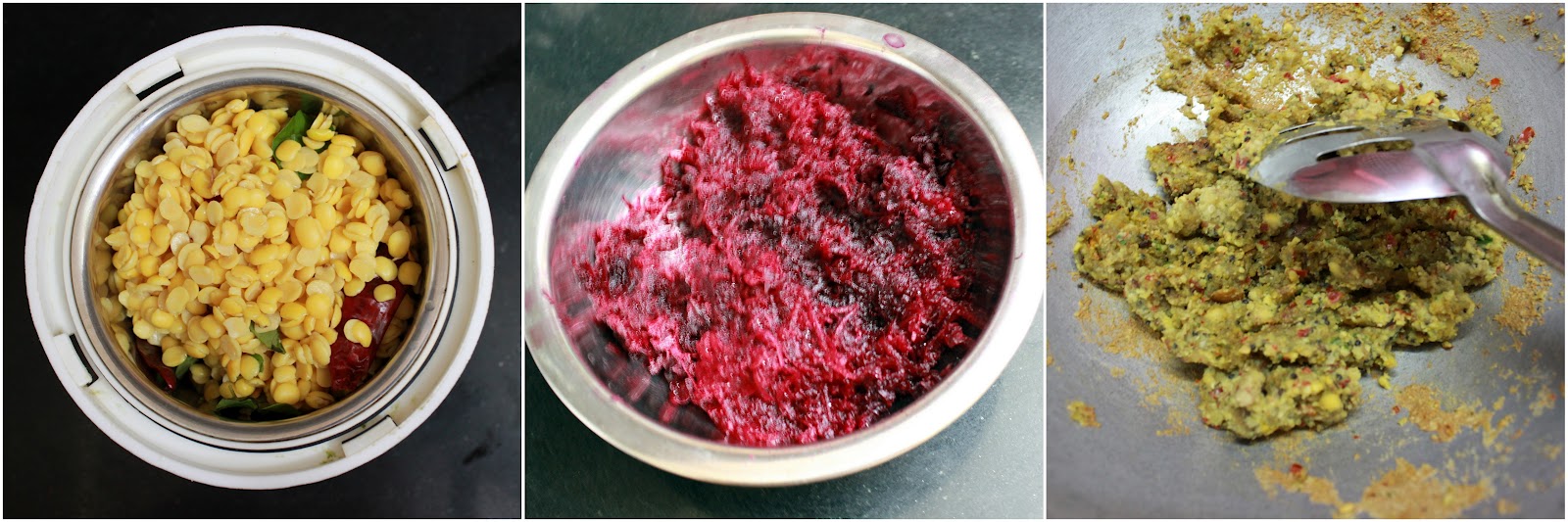 Heat a little oil, add the grated beets and salt, saute it till it turns dry, remove it. Heat oil one more time, add the mustard and cumin seeds, once it splutters, add the asafoetida and the ground tuvar dal, saute it continuously till you get a dry crumble like texture. At this stage mix in the beets and mix well, check for salt, if there are any lumps break them with the back of a spoon, let it cool a bit.